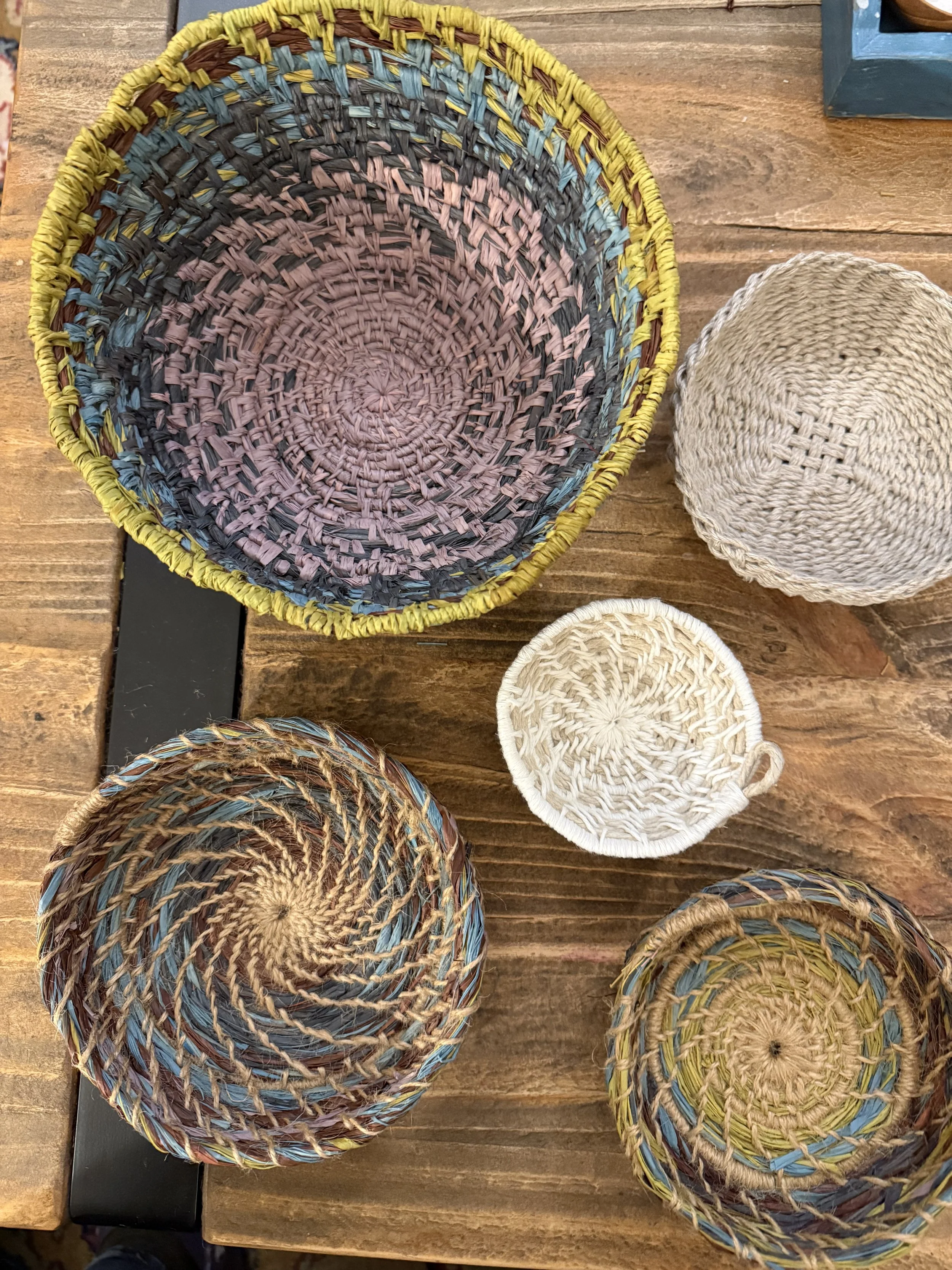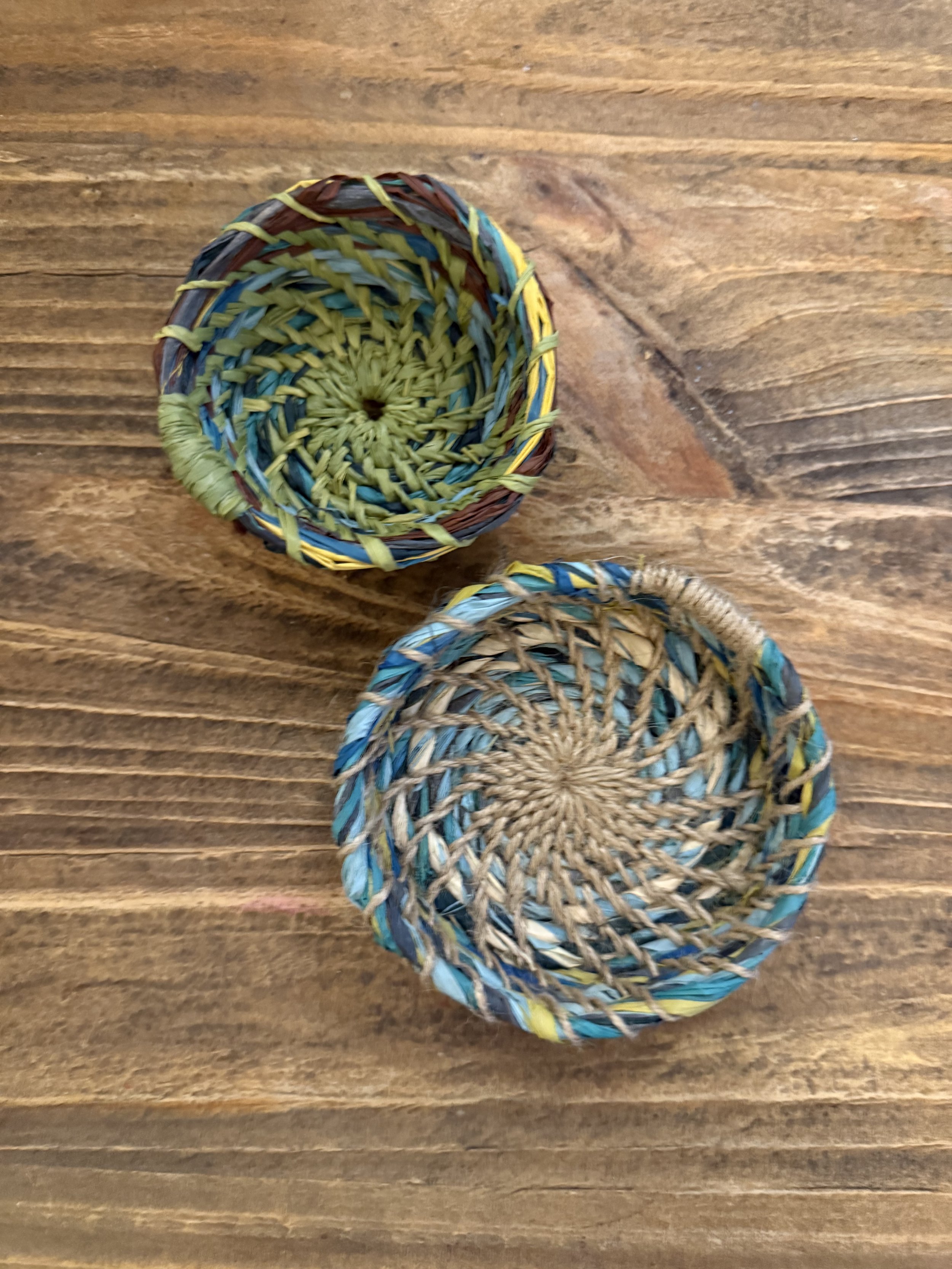 3.5” raffia basket and 4.5” raffia and hemp basket