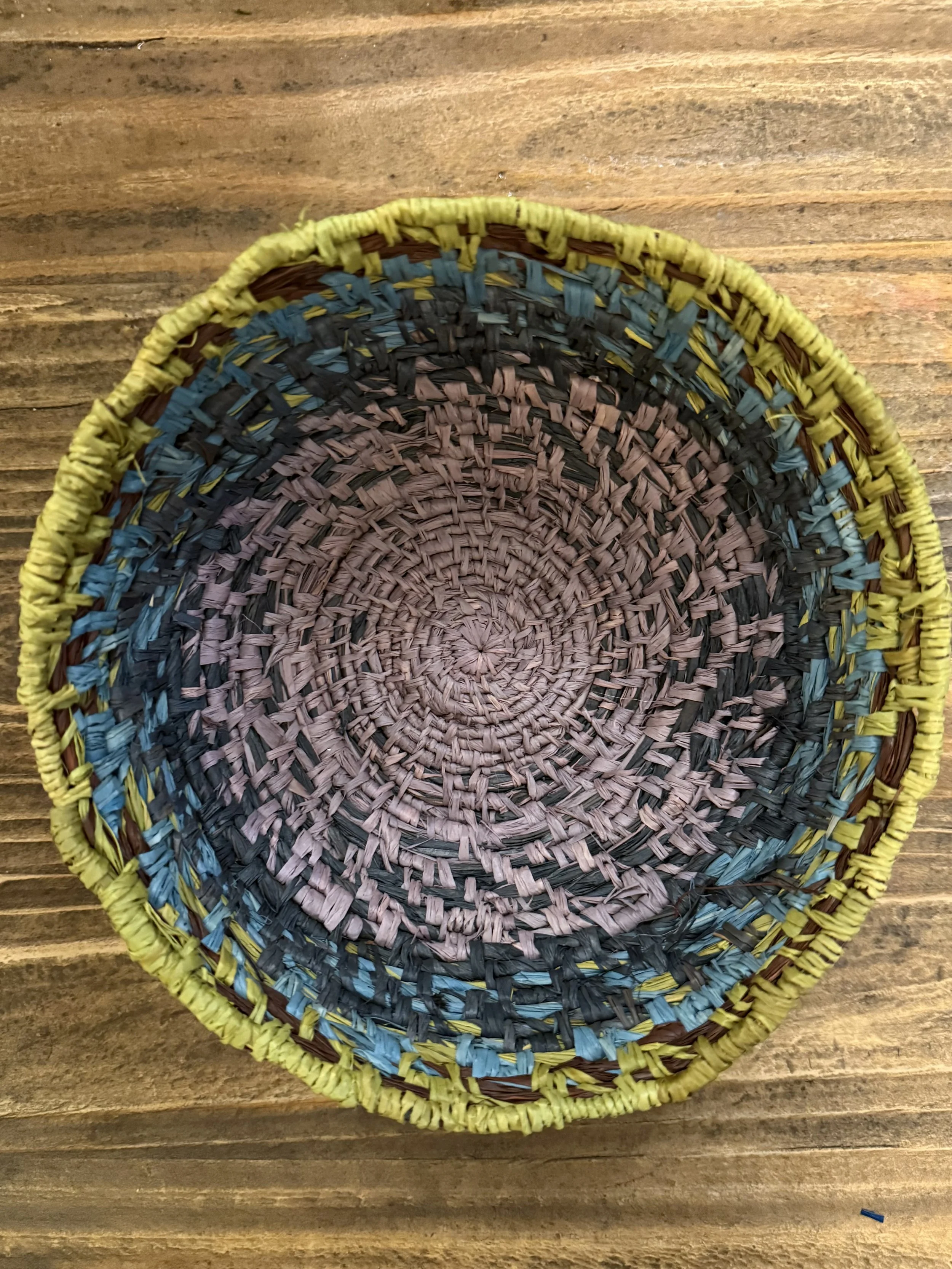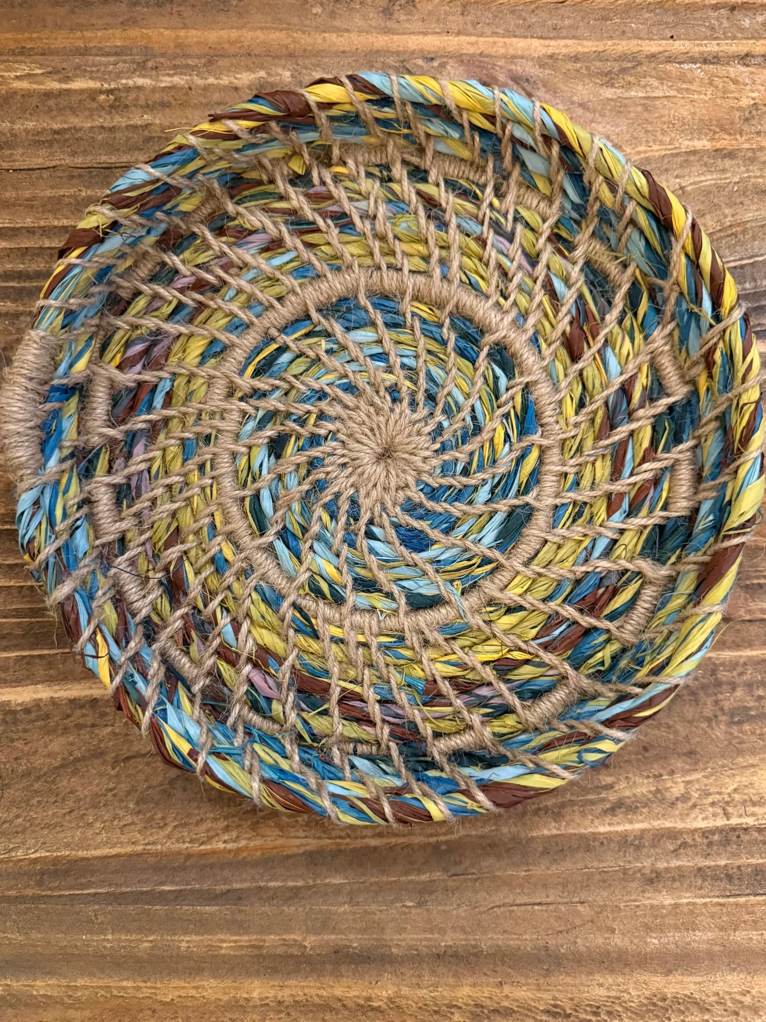 Round multicolor raffia and hemp basket, 5” x 2”deep